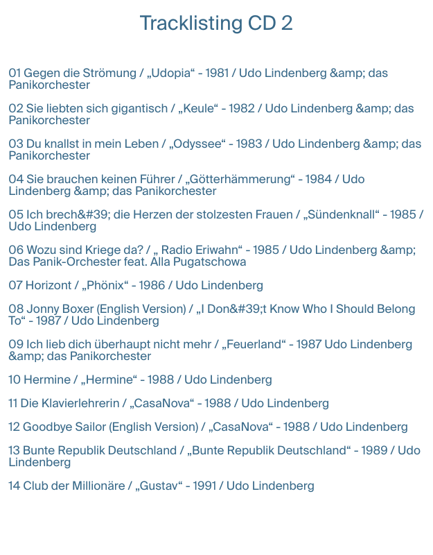 Unter der Headline „Alles unter einem Hut“ erscheint zu Udos Geburtstag eine komplette Produktserie: bestehend aus einer CD Box inkl. 40 Studio Alben plus 5“ CD und 124 seitigen Hardcover-Buch und eine ganz besondere Panik-Compilation als 4 LP Box und 3 CD im Digipack - mit jeweils 41 Tracks. Die 4 LP und 3 CD sind aber keine klassischen Best Of-Kopplungen, sondern ein Geschenk der Fans an Udo Lindenberg. Die Fans konnten im Rahmen eines Fan-Votings abstimmen und ihren persönlichen Favoriten wählen - aus jedem der 40 Studio-Alben einen Song. Udo hatte natürlich einen Wunsch frei und somit war „Komet“ als „persönlicher Wunschtitel“ gesetzt. Die Songauswahl ist eine Zeitreise durch sein musikalisches Schaffen - durch über 5 Jahrzehnte Udo Lindenberg. Ob mit oder ohne Panikorchester, ob auf Deutsch, Englisch (4 Songs) oder Holländisch (1 Song) - immer unverkennbar Udo Lindenberg. Bei einigen Alben war das Ergebnis sehr knapp - wie z.B. bei „Cello“ vom Album „Alles klar auf der Andrea Doria“ (1973) oder "Mein Ding“ vom Album „Stark wie zwei“ (2008) - und bei anderen Alben gab es klare Spitzenreiter wie z.B. „Bodo Ballermann“ vom Album „Galaxo Gang“ (1976) oder „Horizont“ vom Album „Stark wie zwei“ (2008). Aber egal welcher Songs am Ende vorne lag - bei jedem Album haben die Fans entschieden. Einige der ausgewählten Songs waren auch noch nie auf einer Compilation und sind hier auf diesem speziellen Birthday-Package wieder zu entdecken. „Alles unter einen Hut“ - ein panisches Geschenk von und für die Fans.